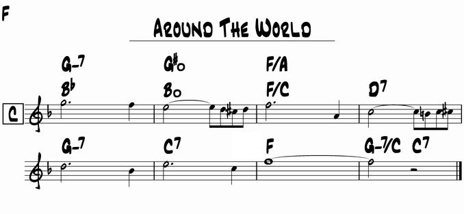 この曲は3小節目の上が F/A となっていますが普通は Am7 です。上の場合は1小節目が Gm7、3小節目が Am7 とマイナーの暗い感じで、下は Bb と F とメジャーの明るい感じで、その違いですね。私はこの曲の場合は明るいほうがいいかなと思いそうしています。