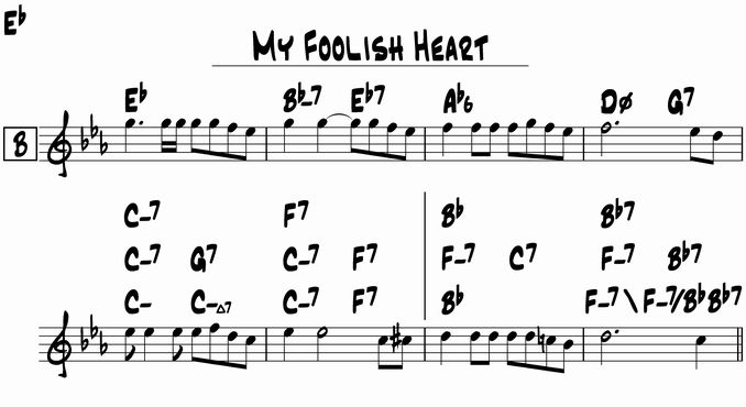 7~8小節目。一番多かったのは真ん中でした。この部分は色々ありそうと思っていましたが、意外と少なかったです。大きくは7小節目を Bb のメジャーにするか、Fm7 にするかの違いです。一番下は一番上を細かくした形です。私は7小節目の Fm7 はメロディの D と合わないように感じるので Bb にしています。Fm6 であれば合うのですが、進行的には好みではないです。まあ普通 II-V で Fm6 - Bb7 はないですよね。