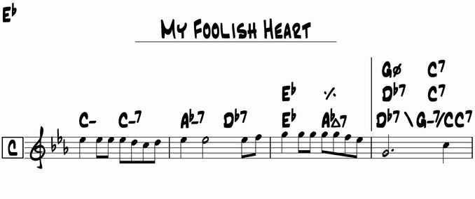 4小節目。真ん中が多かったです。ただ私の一番下は C7 を細分化しただけでほぼ同じです。一番上は II-V で、これが普通の形ですが、譜面類はあまり無かったです。実際演奏もほとんど真ん中か一番下が多いと思います。
