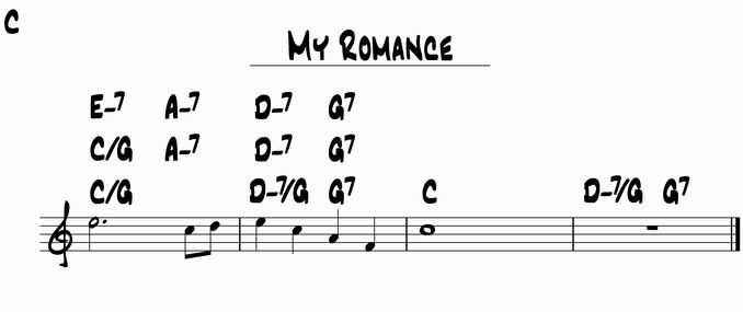 あと一番上の進行がありました。3-6-2-5 ですが、この最初の Em7 ですが私は流れ的に C/G のほうが好きです。
