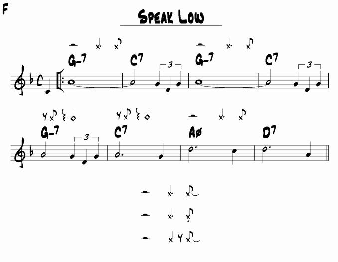 この曲はインストではアップテンポのスイングで演奏される事が多く、その時は譜面のようなキメが使われる事が多いですよね。