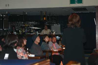 飲んでいると、私にお客さんから「もう一度ぜひ演奏を聴きたい」と言われてしまいました。打ち上げでは多少なりとも酔っぱらっているのであまり演奏したくないんですけどね。それに私はピアノソロがあまり好きではない。しかしベースは池田さんしかいない。ん?一応古地くんもいるが(^^)。こんな時に池田さんに弾いてもらうのもなあ。でも一応お願いしてみました。そしたら「やろう」という事に。結局レイさんも歌いました。その後は地元のアマチュアのミュージシャンたちの歌や演奏がありました。楽しい一時です。