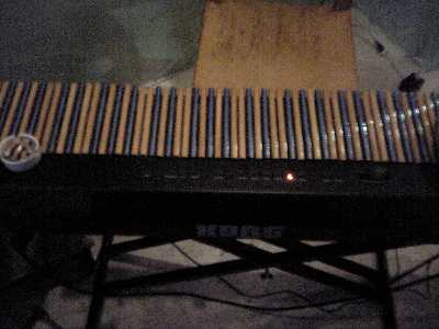 ここで驚いたのが、菅野さんが持って来ていたキーボードです。店にはピアノがなく持ち込みだったのですが、菅野さんのキーボードは特注の物でした。黒鍵の凸凹部分がなく、黒鍵が白鍵と同じ長さにビーンと伸びています。画像を撮りました。茶色の部分が白鍵ですが、黒鍵の凸凹がなく、白鍵と黒鍵の長さが同じです。しかも幅も同じです。結局、同じ大きさの木を横にずらっと並べて黒鍵部分を黒にしているだけです。なんでこんなキーボードを特注で作ったかというと、簡単に平行移動が出来る、結果、簡単に移調が出来る、からです。普通の鍵盤だと例えば半音の移調は大変ですが、このキーボードだと平行移動だけで済みます。これは優れ物です。ただ慣れるのは大変だと思いますけどね。菅野さんも練習中といっていました。といっても、この日はこれを使ってライブをやっていましたが(^^)