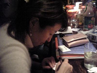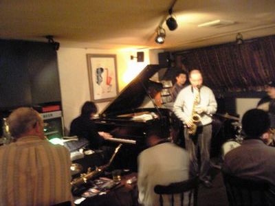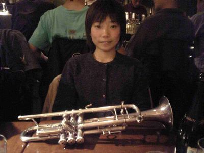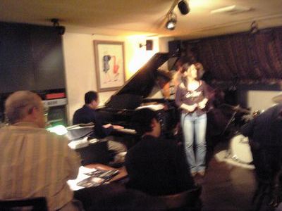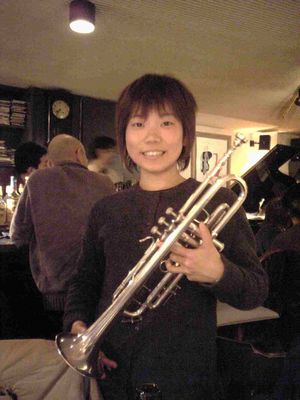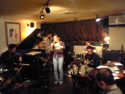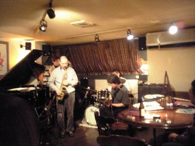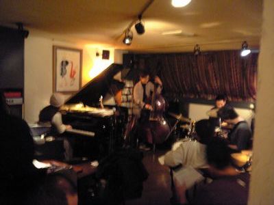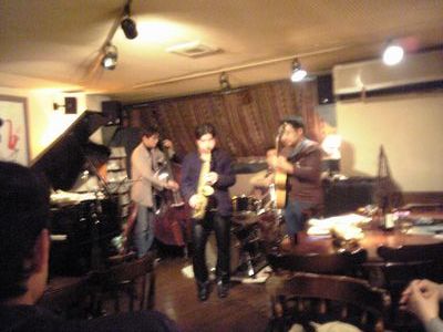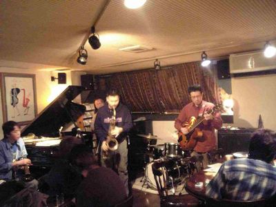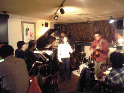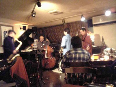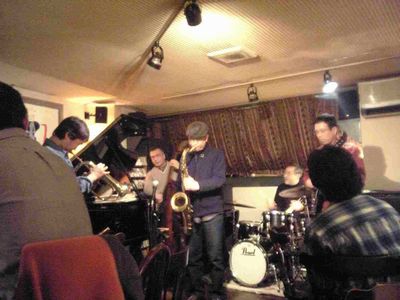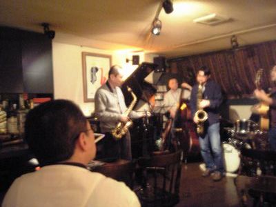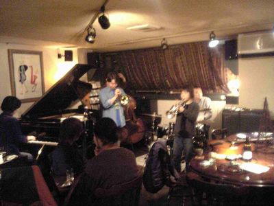 しばらくしてセッション開始。するとジャズ研後輩のトランペットの清水まる子ちゃんが来店。店は初めてだったそうですが、前々から来てみたかったとの事でした。その後、11月末のクラリネットの谷口英治くんのバンドで初めて一緒になったベースの山口裕之くん、リバーサイドの神様こと古庄さんなどが来店しました。