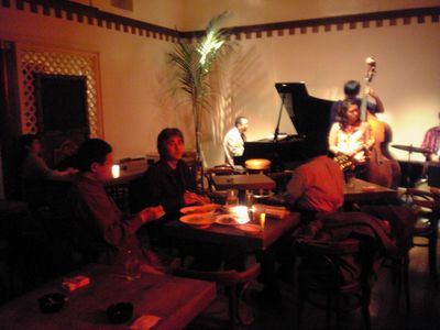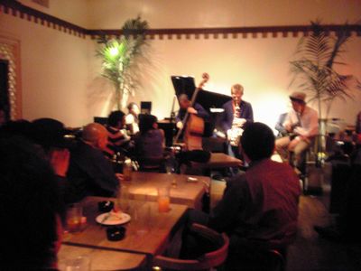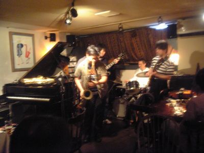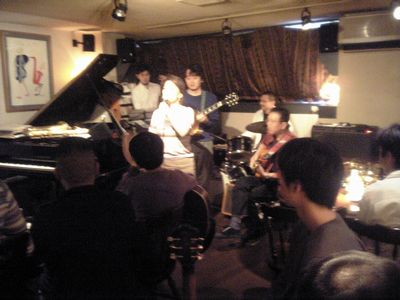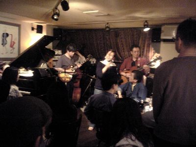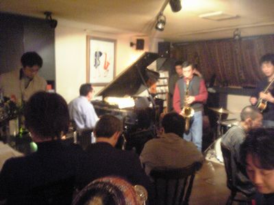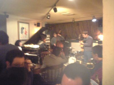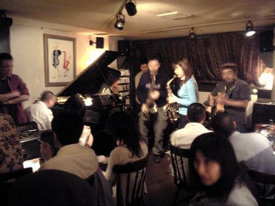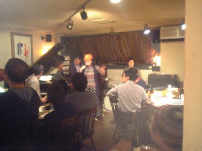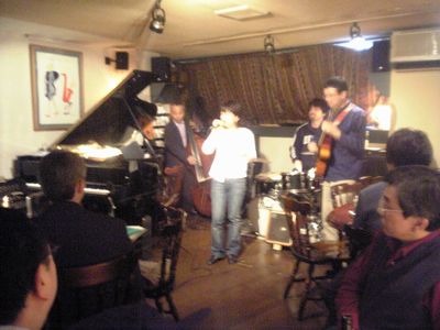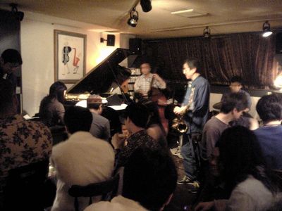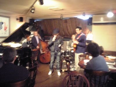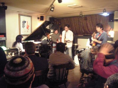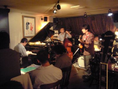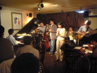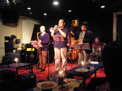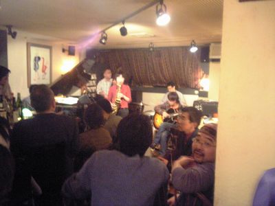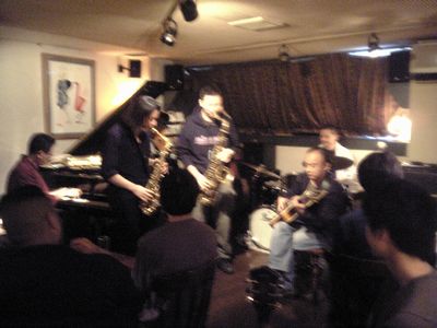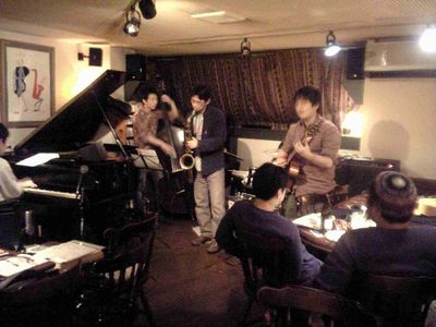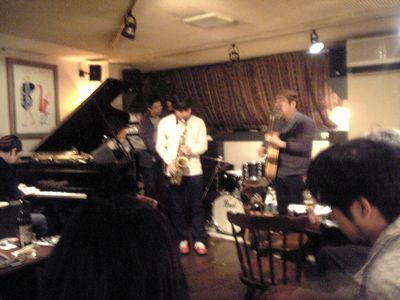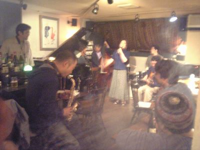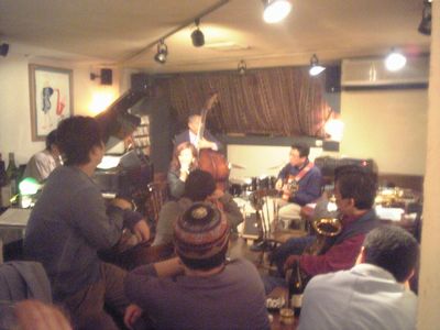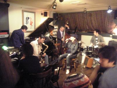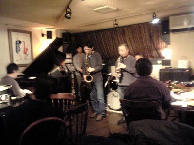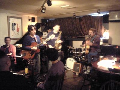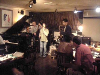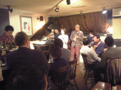 店に入ると、すでにマスター+ホストバンドで演奏が始まっていました。お客さんもすでに何人か入っていて、ギターのヨッシーさん、ヴォーカルのたむらとし子さんもいました。次第にお客さんも入ってきて、レイさんやくにくにや伊地知くんも来て、いつものT'sセッションになりました。法政大学のビッグバンドの後輩のテナーのヨネ(米村守)にも久しぶりに会いました。私が覚えているメンバーです。