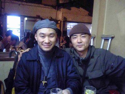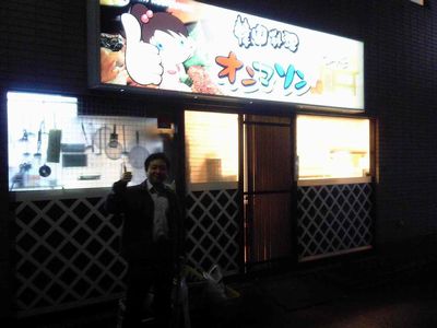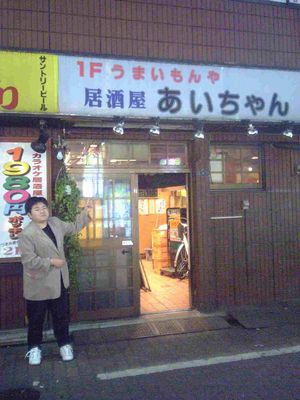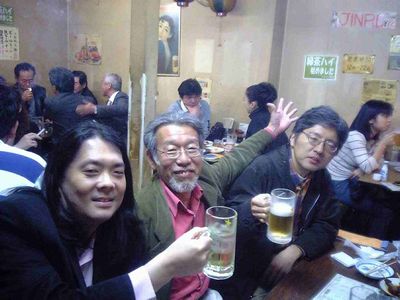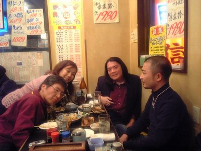 18時半頃に大井町の駅で待ち合わせて、まず、私が昔よく行っていた、炉端焼き「大鵬」へ行きました。この居酒屋は昔、西大井駅の近くのスタジオでよくセッションをしていた後に行ってたんですよねぇ。「大鵬豆腐」という、豆腐に納豆や山芋等が乗っているメニューがあって、最初から全部かき混ぜて、みんなですすりながら回し食いをする、というとても下品な事をやっていました(^^)。んな事をしていると店のおっちゃんに「何やってんだよ!」って怒られるんですな(^^)。私は10年ぐらい店に行ってなかったと思います。ここでくにくにと閉店の23時まで飲みました。