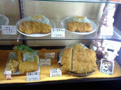 実は外のメニューを見て驚いたのですが、この店は「とんかつ大食いにチャレンジ」というのがあって、巨大とんかつを設定時間内に完食すればタダになったり賞金が出たり、というのがあるようなのですが、その巨大とんかつは半端ではありませんでした。あまりに凄かったので、写真を撮りました。