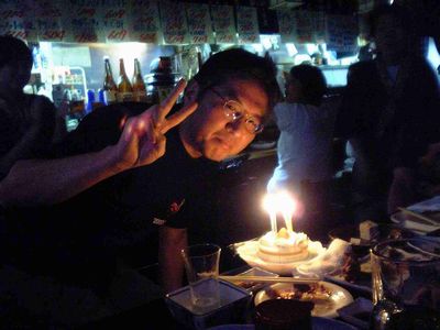 そしてしばらくしてからです。突然、店の電気が消え、ケーキが出され、BGMが「ハッピーバースディ」に・・・。誰もまったく予想してなかったので、みんな驚きました。店の人がわざわざ密かにケーキを買いに行っていたのです。という事で突然「林正男