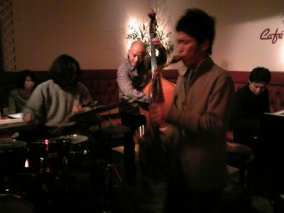 ドラムの横山和明くん。この日は用事があったらしく、セッションの最後のほうで来店して演奏はしませんでした。彼とはT'sのホストバンドを2回一緒にやった事があります。他にもT'sや高田馬場のコットンクラブのセッションで会いました。16歳の時に渡辺貞夫さんのグループに抜擢された素晴らしいドラマーです。その彼ももう23歳ぐらいかな。といっても若いです。