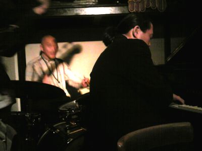 打ち合わせが終わってライブ開始を待っていると、入口から男性客らしき人が中に入り、私のところへ来て「お久しぶりです!」と。見るとドラムのバクちゃん(山口新語)でした。彼にはあらかじめメールしておいたのですが、オフがなくて、この日の彼の仕事が始まる前にJに寄って私に会う程度の時間しか取れなかった、との事でした。そこまでして来てくれるというのはとても嬉しいですね。彼とは10年ぐらいの付き合いになります。初めて会ったのは四ッ谷のウィルという店でテナーの岡崎正典くんのグループでした。それ以来色々な仕事で一緒にやりました。会うのは4年半ぶりぐらいでした。時間がないとの事で少しだけ会話して彼とは分かれました。