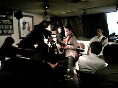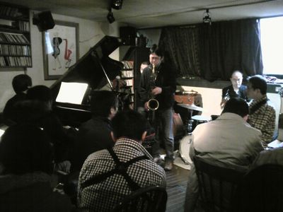 20時過ぎに店へ。階段を下りていくと、店のドア外の階段のあたりに4、5人ほど楽器を持った若者が座っていました。既に満員のようです。店内へ入るとマスターや店長の井上さんがカウンターの中にいて挨拶。ジャズ研大先輩でイントロセッションの常連の村山先生が演奏中でした。