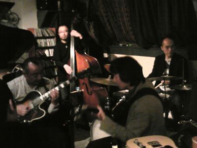 他にも、私は初対面となる、ギターの宮崎信義さん、女性ギターの志賀由美子さん、若手ベースの佐藤有介くん、他にも名前がわからない方が大勢いらっしゃしました。この日のT'sセッションは、途中でのお客さんの出入りも多かった上に、常に椅子の取り合いになっているほどの混雑ぶりでした。