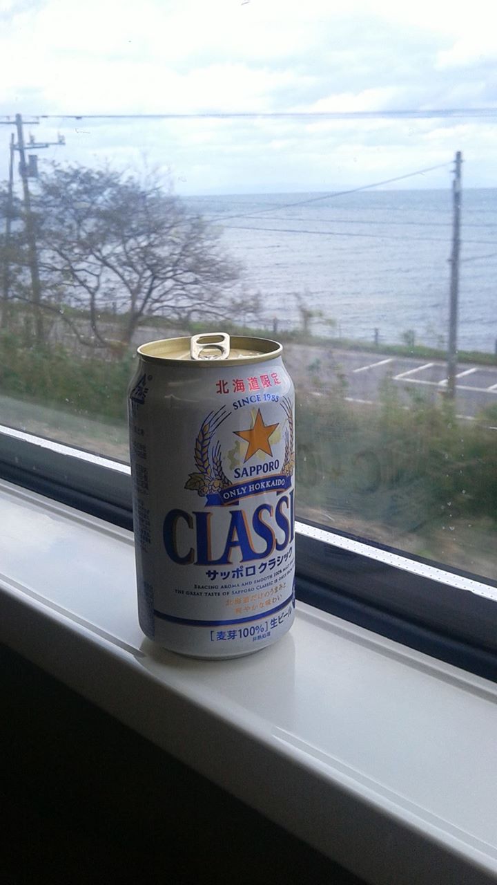 新函館北斗駅から特急スーパー北斗に乗って札幌駅へ。函館本線・室蘭本線・千歳線経由で運行する特急らしい。まだ新幹線は出来ていない。車内販売で売っていたビールと、函館付近の海。3時間30分。道内なのにかなり遠いです。
