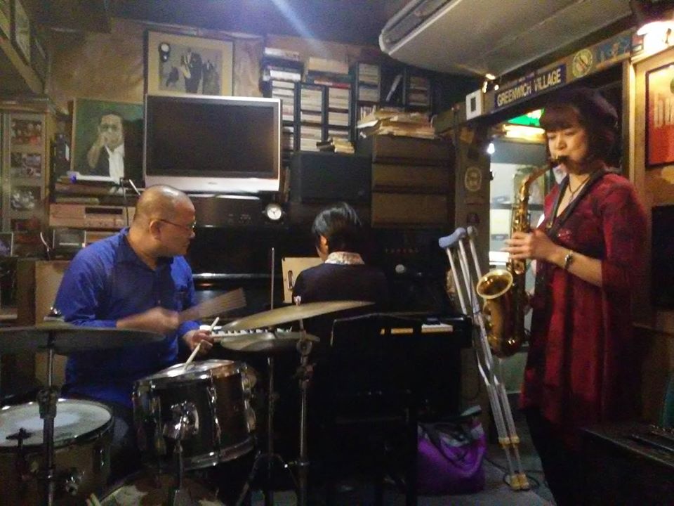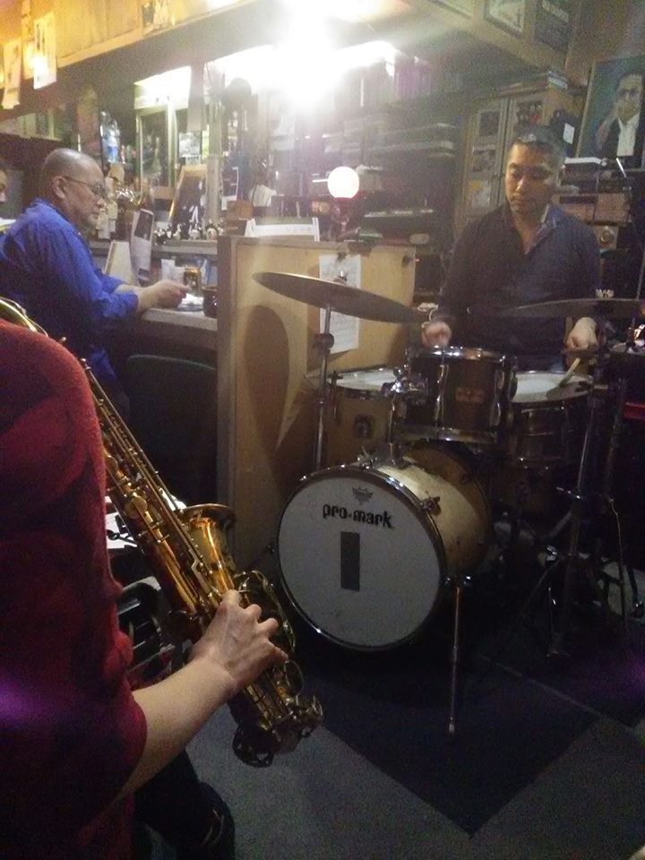 入店し、みんなに挨拶をしてからのセッション。店内が狭いため、アルトのぎゅうちゃん(吉野ミユキ)は私の左横で吹いています。ぎゅうちゃんは私が大学卒業後にすぐ知り合いました。もうかなり長いですね。