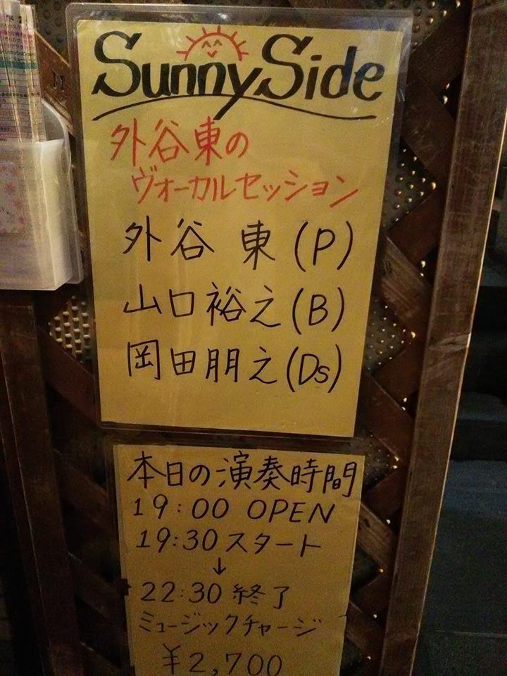 今回行ったのは通常のセッションではなくヴォーカルセッションで、ピアノの外谷さんがホストのリーダーでした。ピアニスト同士はなかなか会う機会がないですが、外谷さんとは何度か会った事があります。