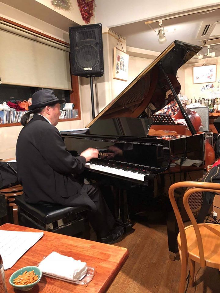 そしてピアノの席に座ると、ピアノ近くのカウンターから「じみたさーん!」と。店内が暗い上に視力が悪いので、名前を聞くと・・・ドラムの高橋徹くんでした。彼とは20年以上の付き合いでよく一緒に演奏しました。ここで会えるとは嬉しいです!