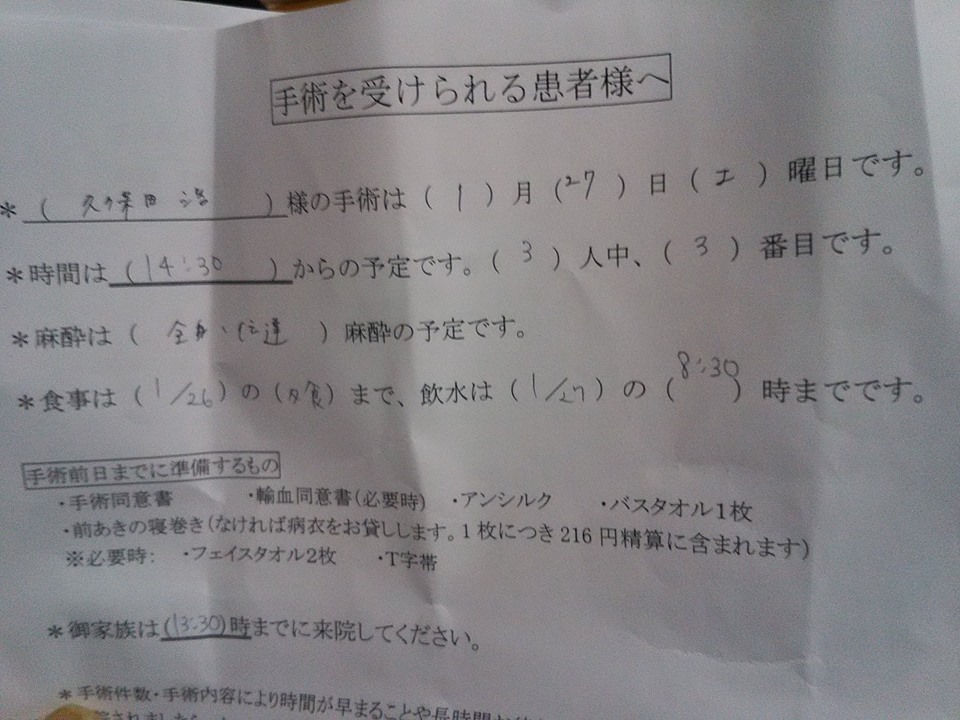 手術は午後2時頃からの予定。この日の食事は無しで、水分も朝8時までです。