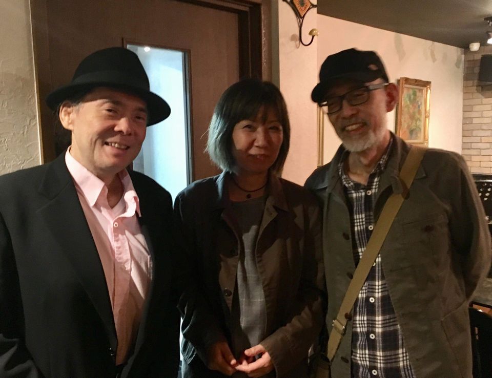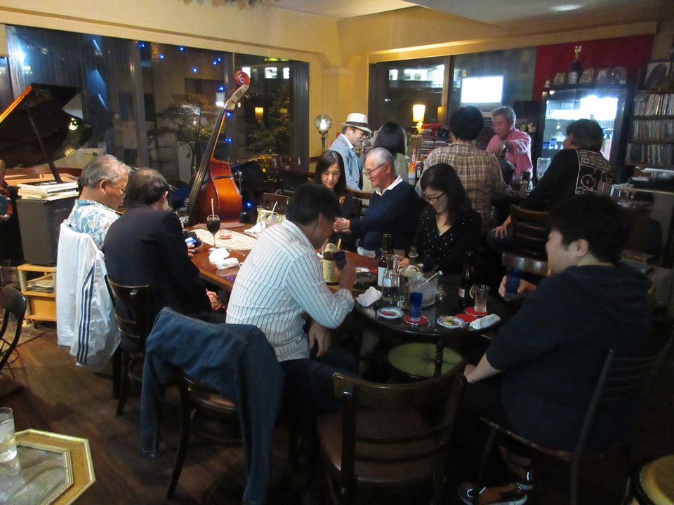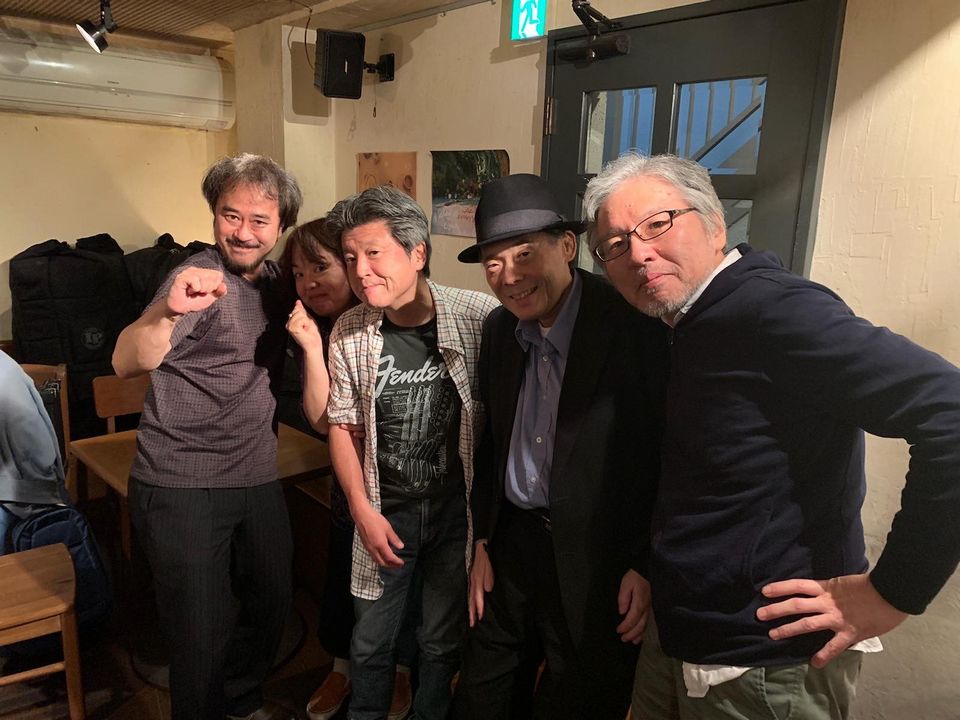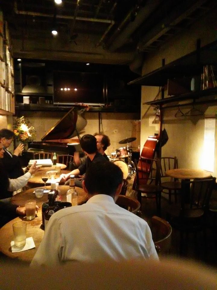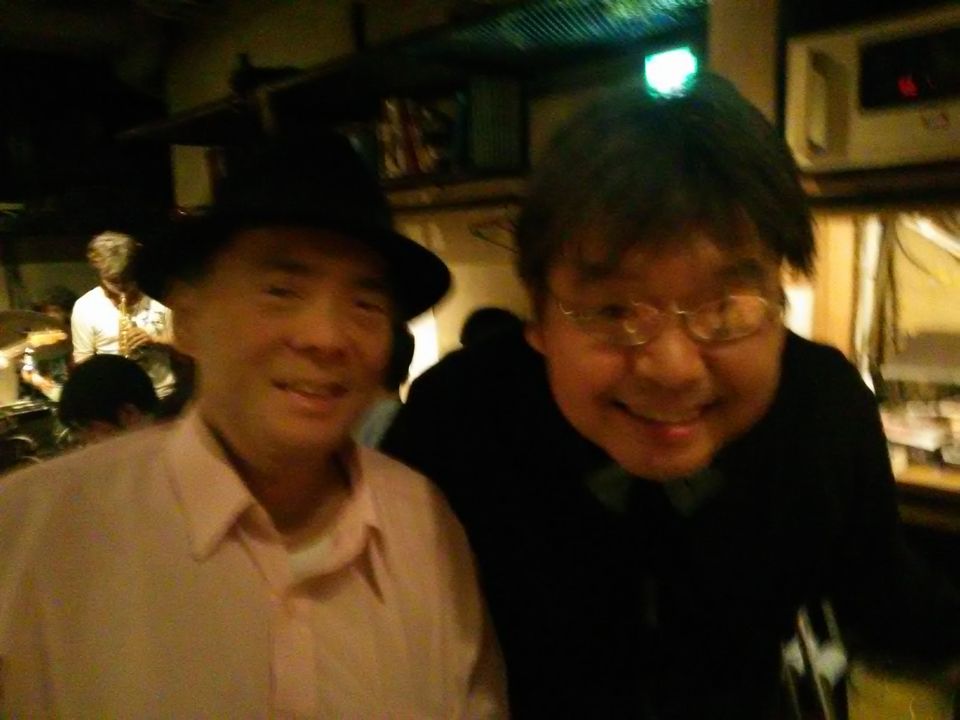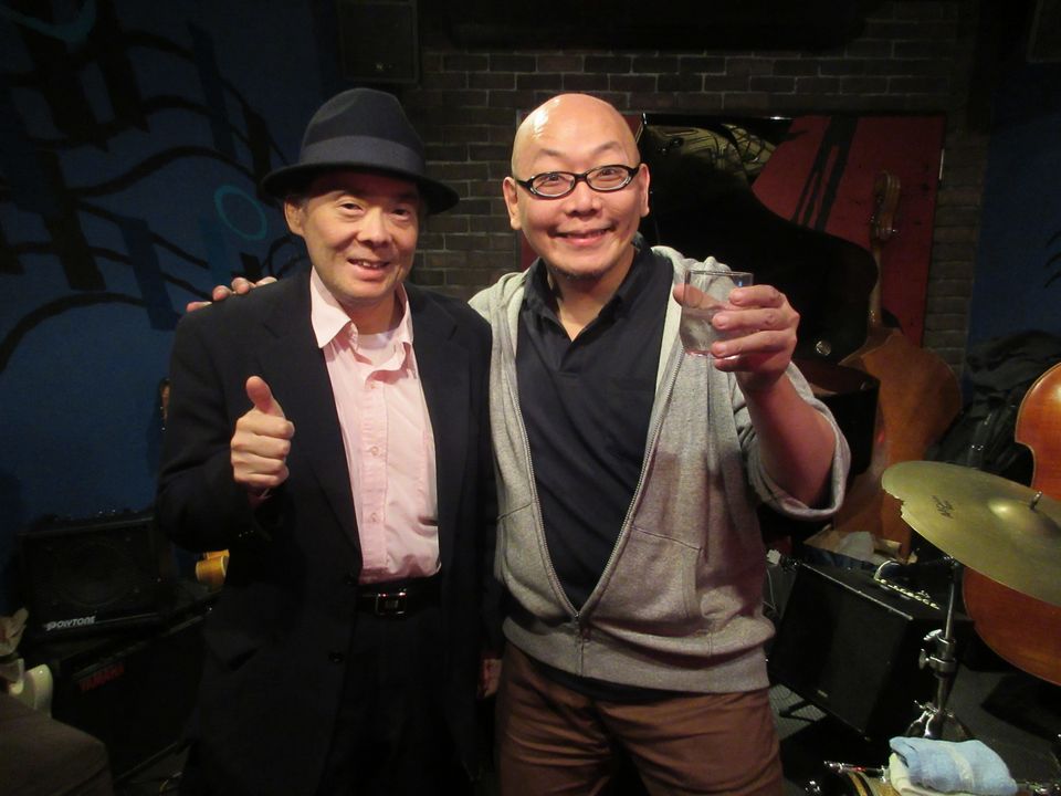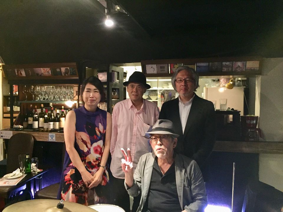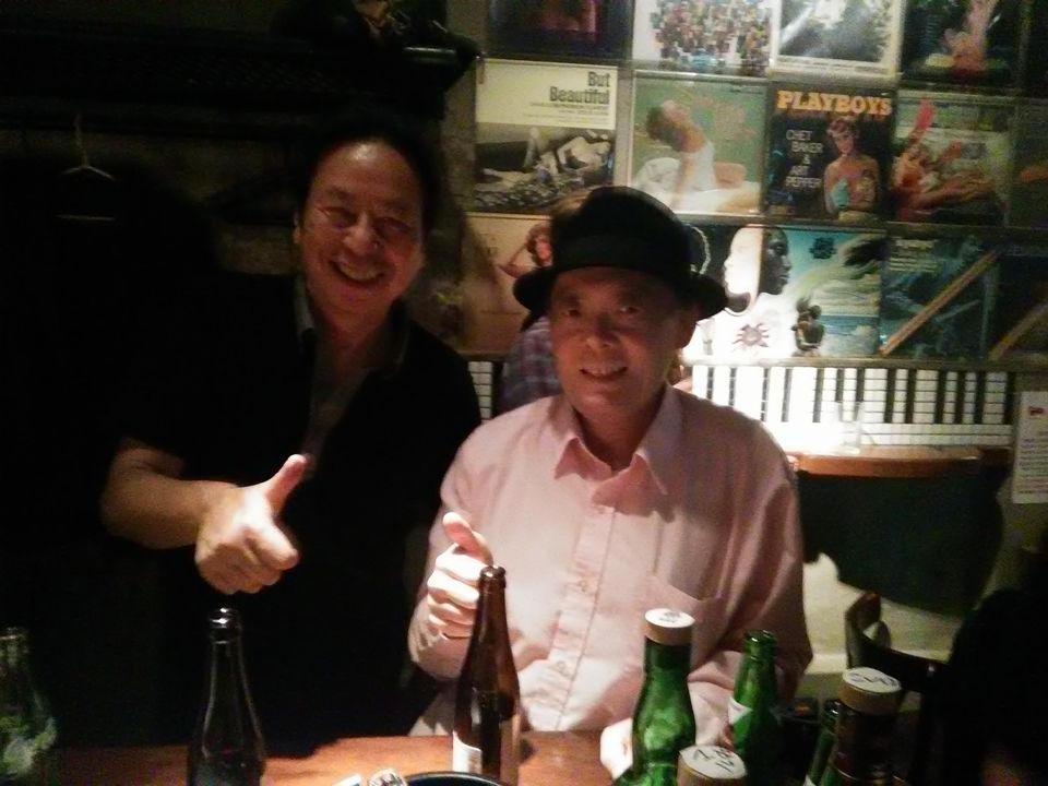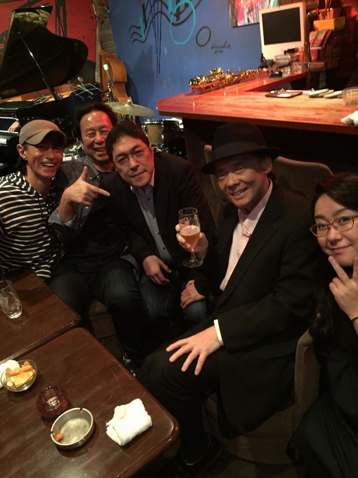 後ろのテーブル席には常連のドラムの廣江さんがいました。昔からライブやセッションでお世話になっています。村山先生は演奏中で、終わって挨拶。今回の東京ツアーでは2回めです。カウンターには最近セッションでたまに会うドラムの中山さんもいました。
