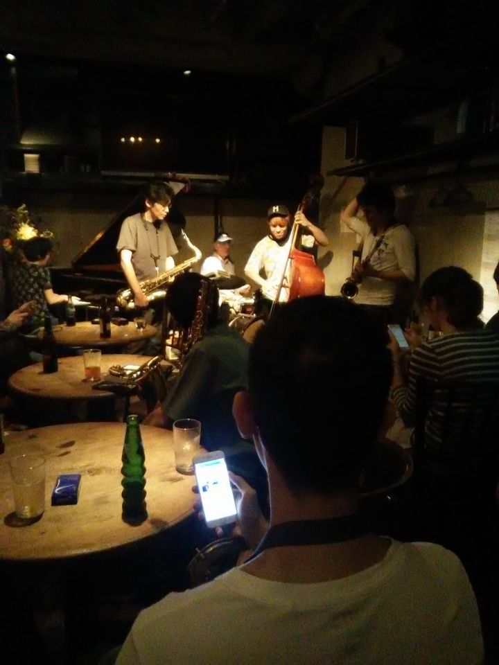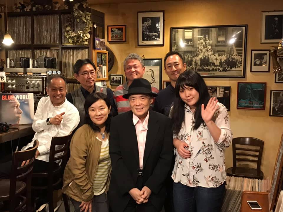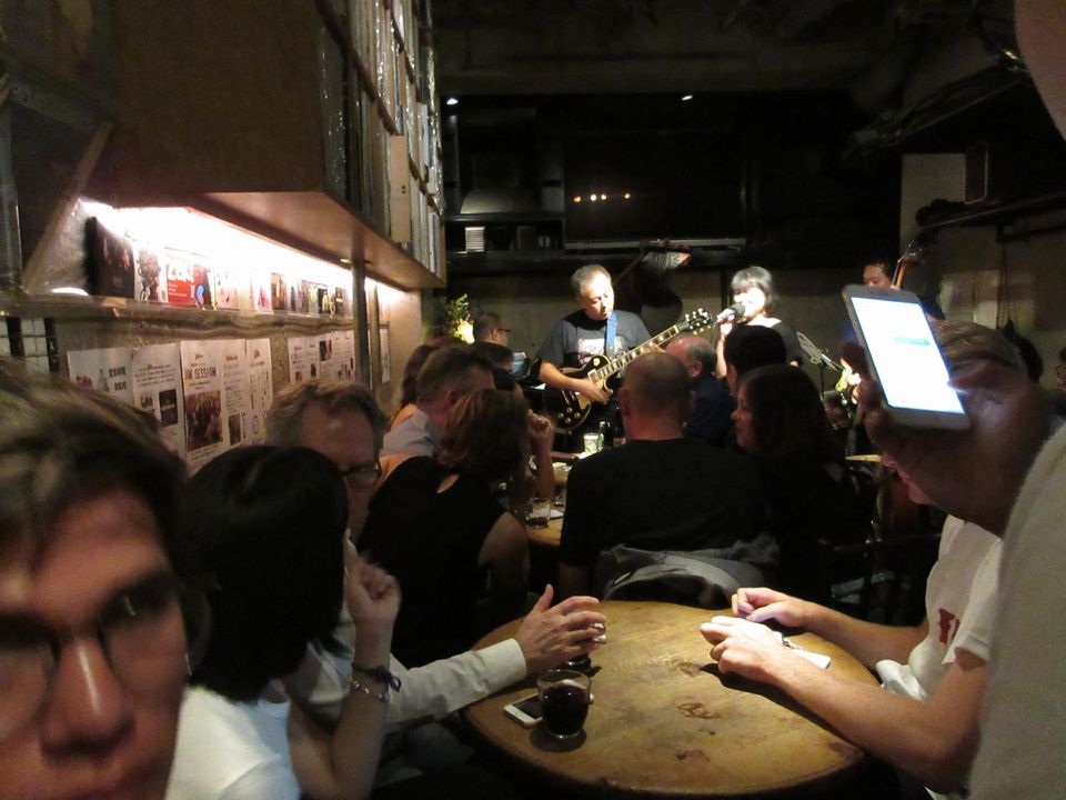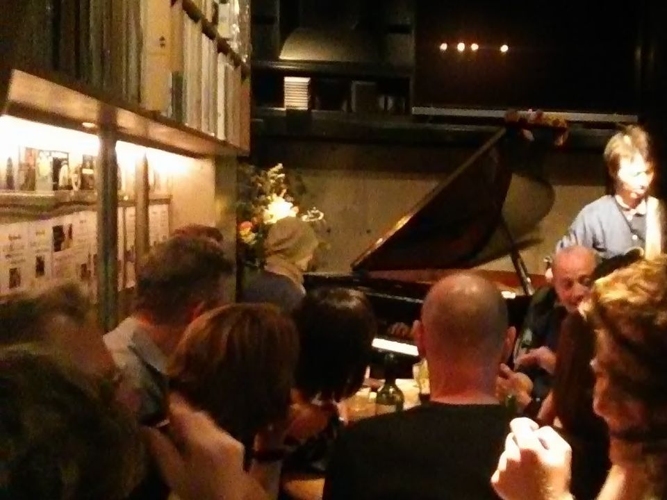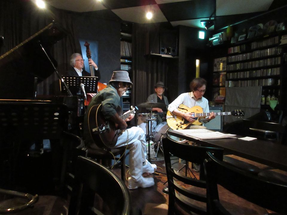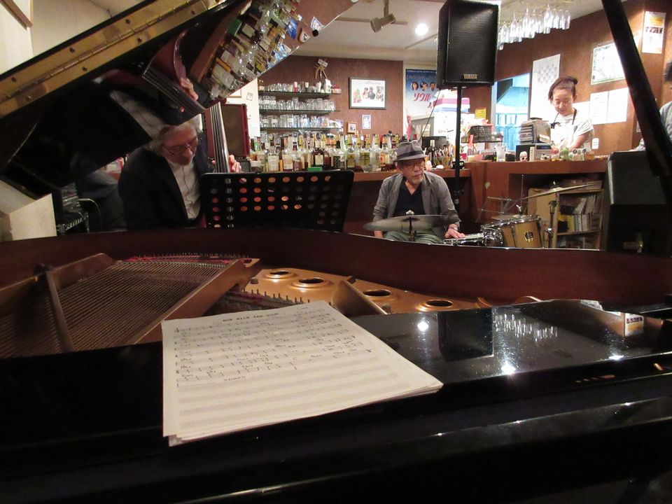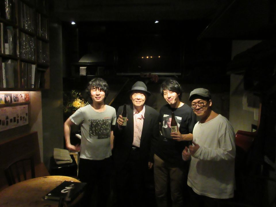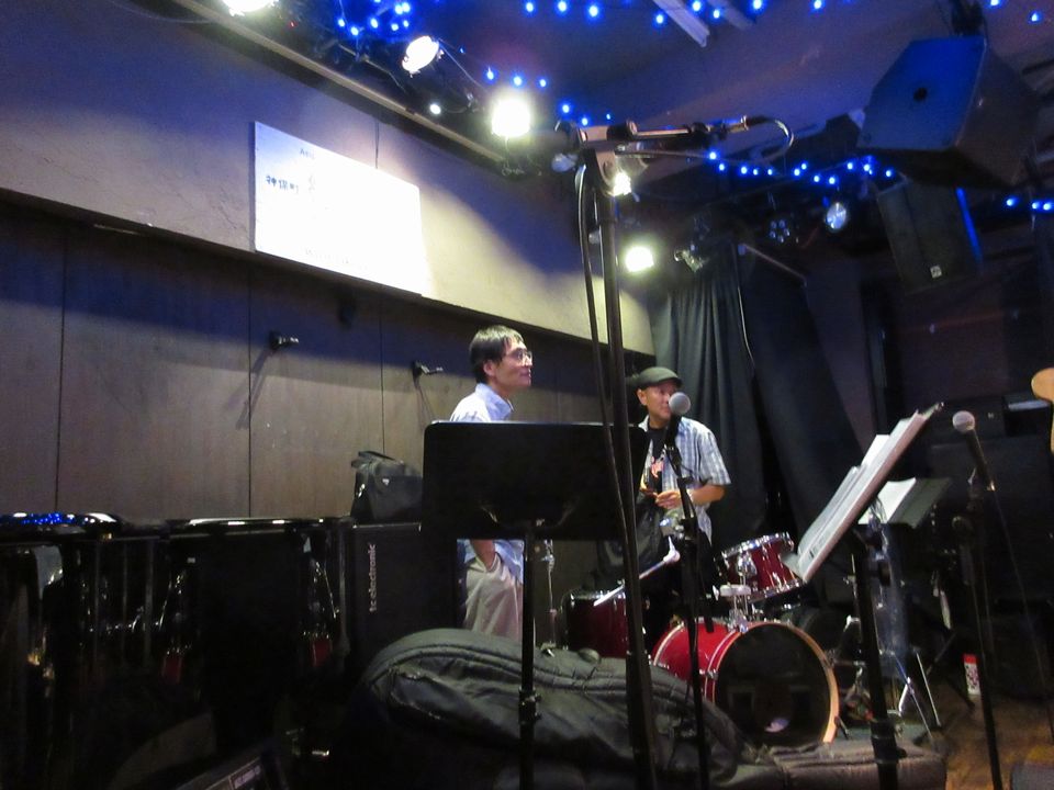 後ろのテーブル席には常連のドラムの廣江さんがいました。昔からライブやセッションでお世話になっています。村山先生は演奏中で、終わって挨拶。今回の東京ツアーでは2回めです。カウンターには最近セッションでたまに会うドラムの中山さんもいました。