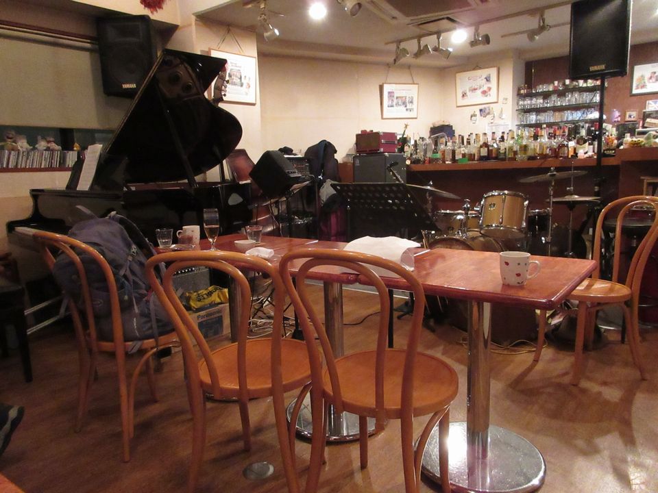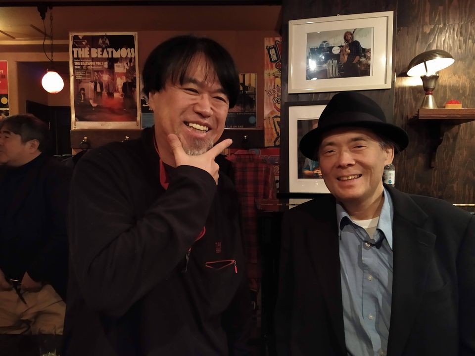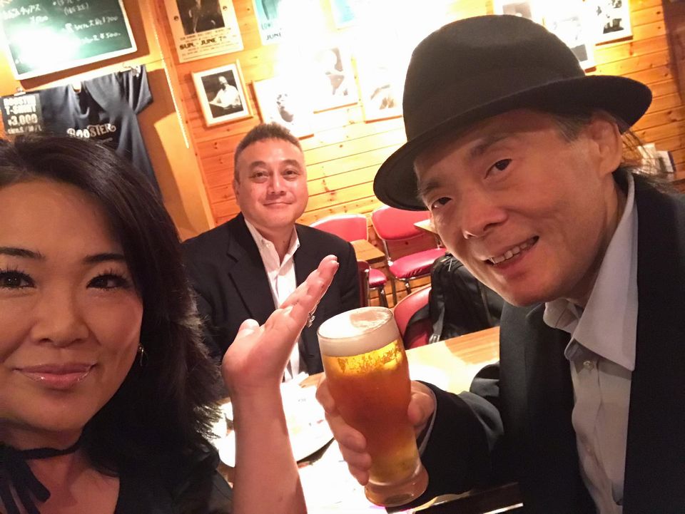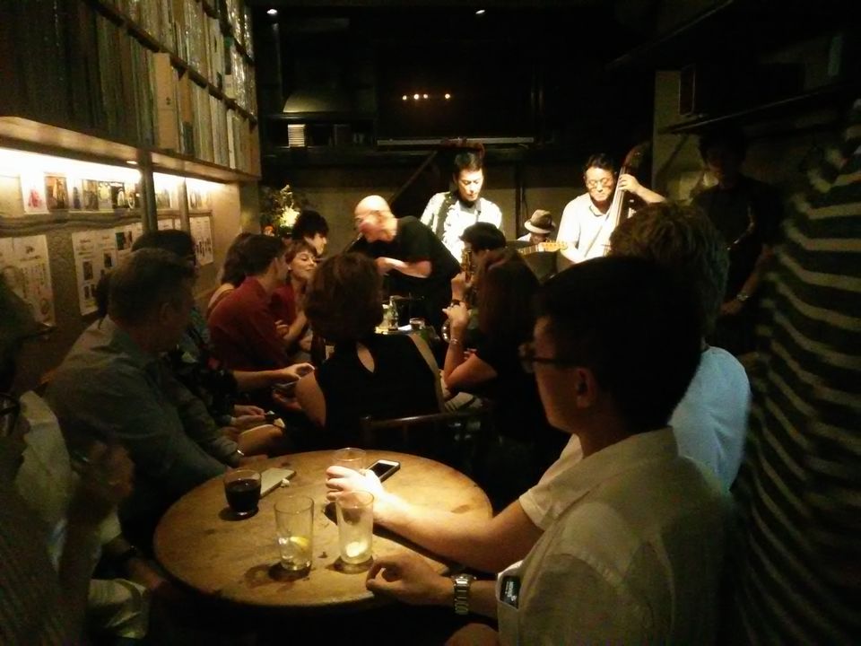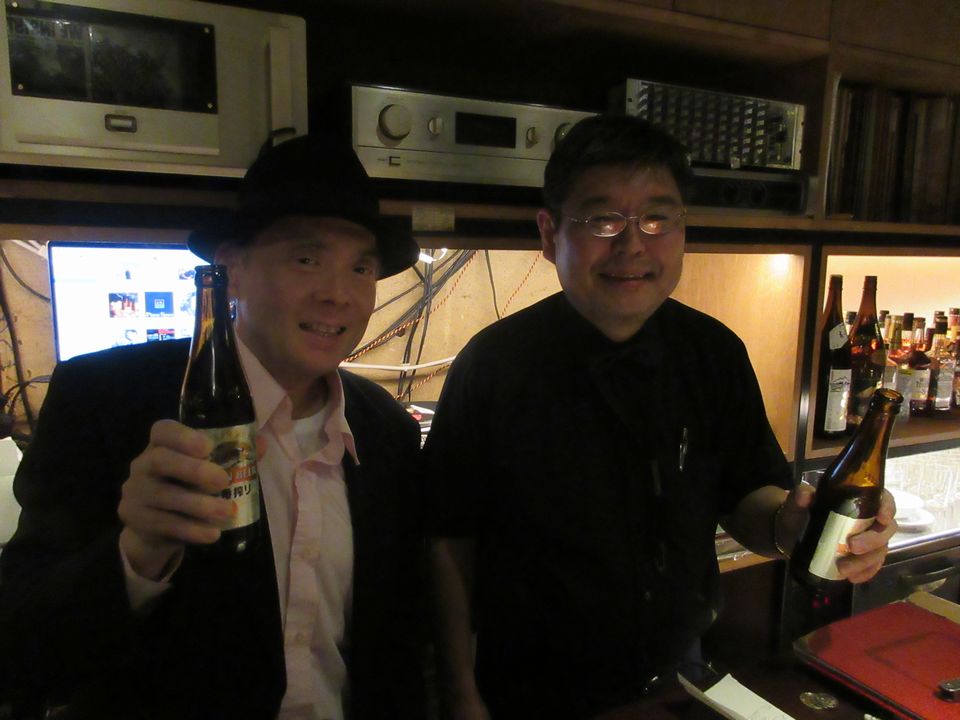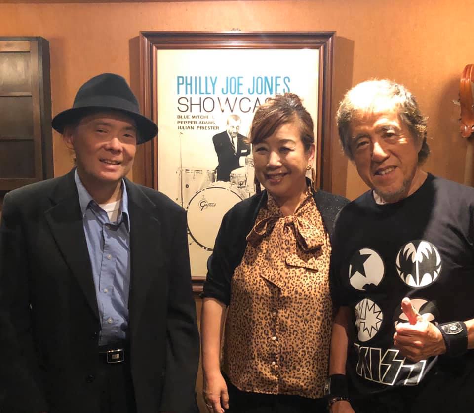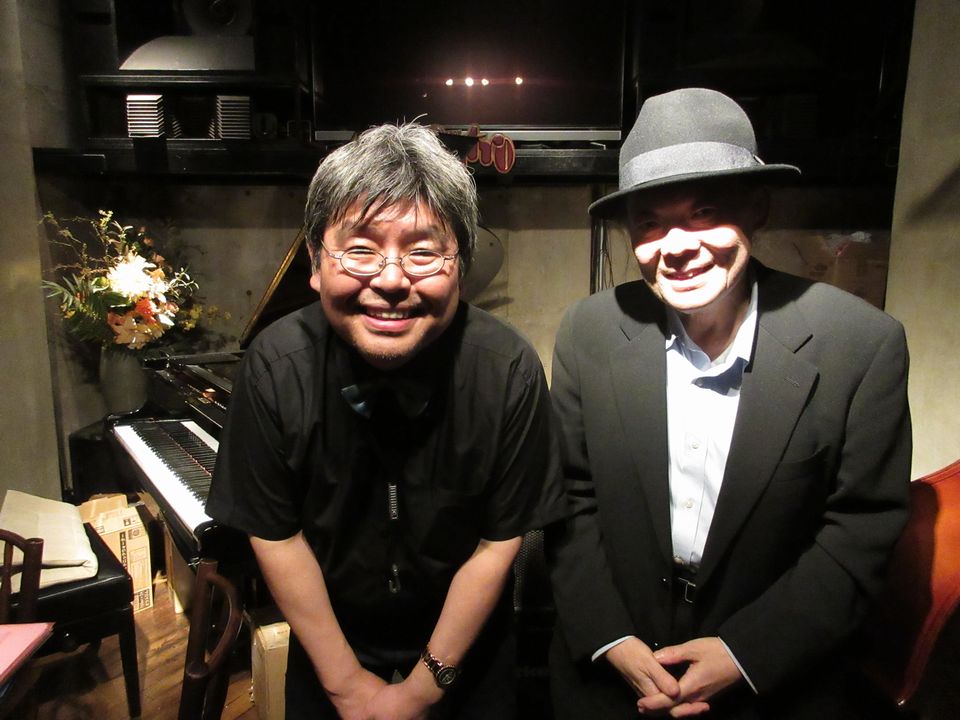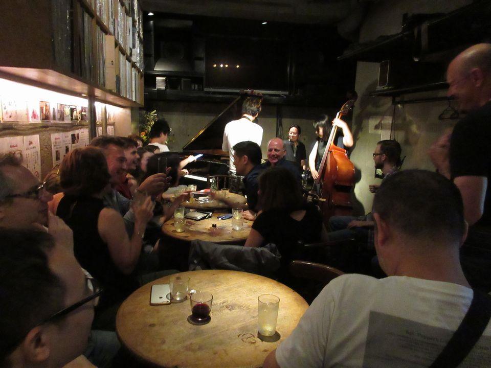 後ろのテーブル席には常連のドラムの廣江さんがいました。昔からライブやセッションでお世話になっています。村山先生は演奏中で、終わって挨拶。今回の東京ツアーでは2回めです。カウンターには最近セッションでたまに会うドラムの中山さんもいました。