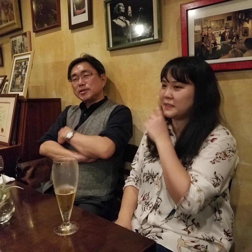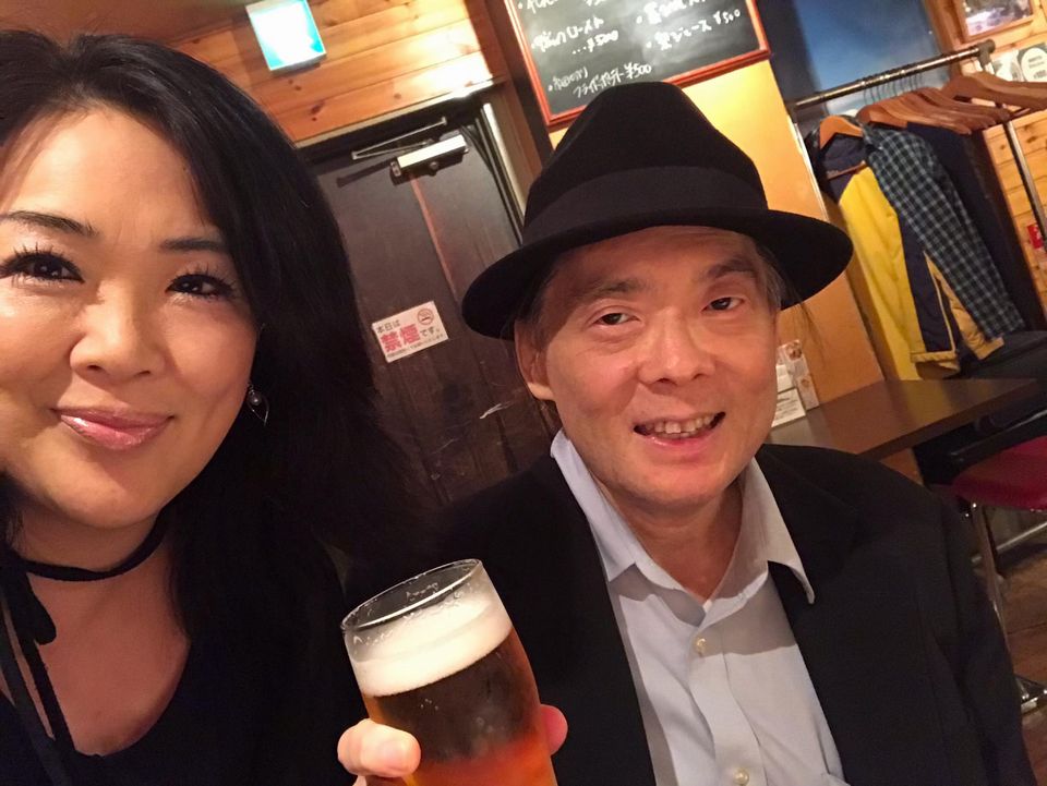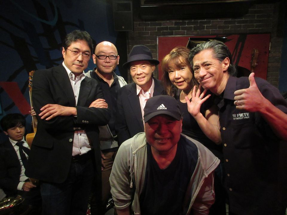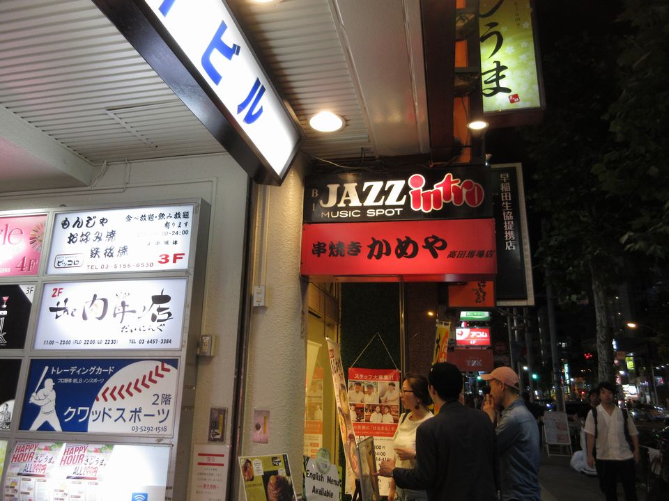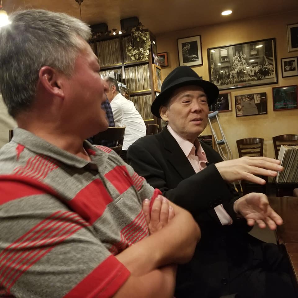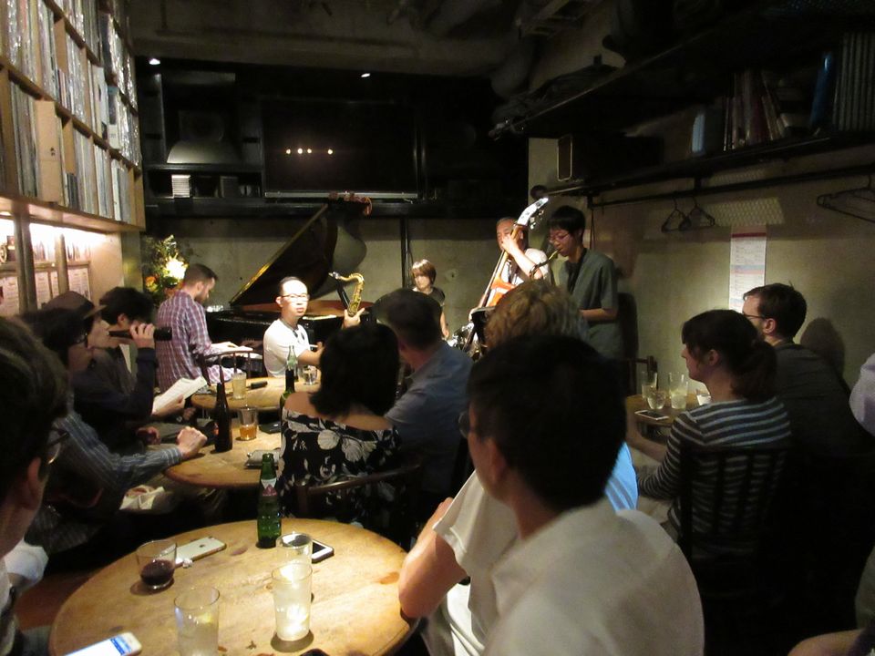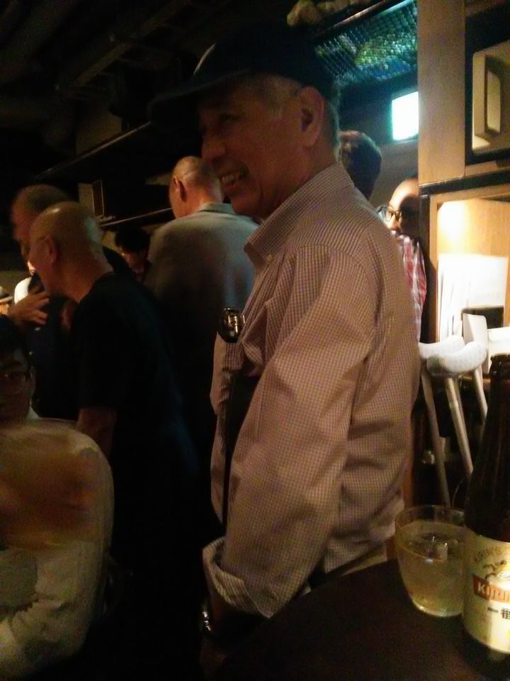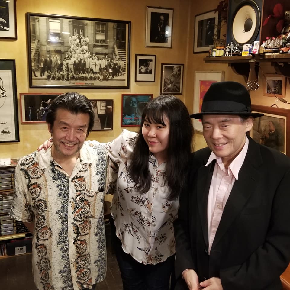 後ろのテーブル席には常連のドラムの廣江さんがいました。昔からライブやセッションでお世話になっています。村山先生は演奏中で、終わって挨拶。今回の東京ツアーでは2回めです。カウンターには最近セッションでたまに会うドラムの中山さんもいました。