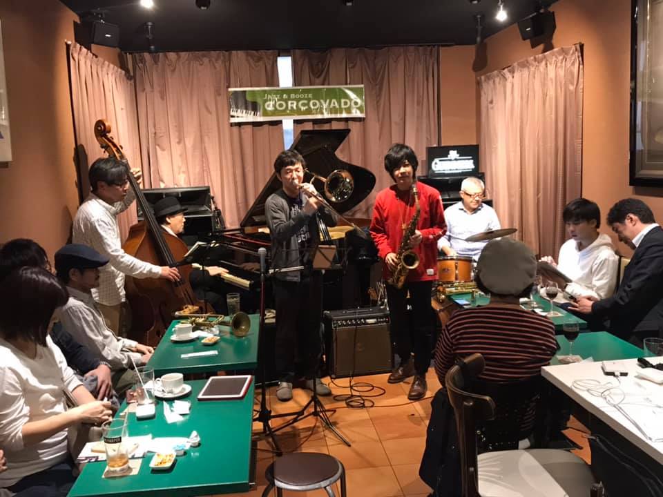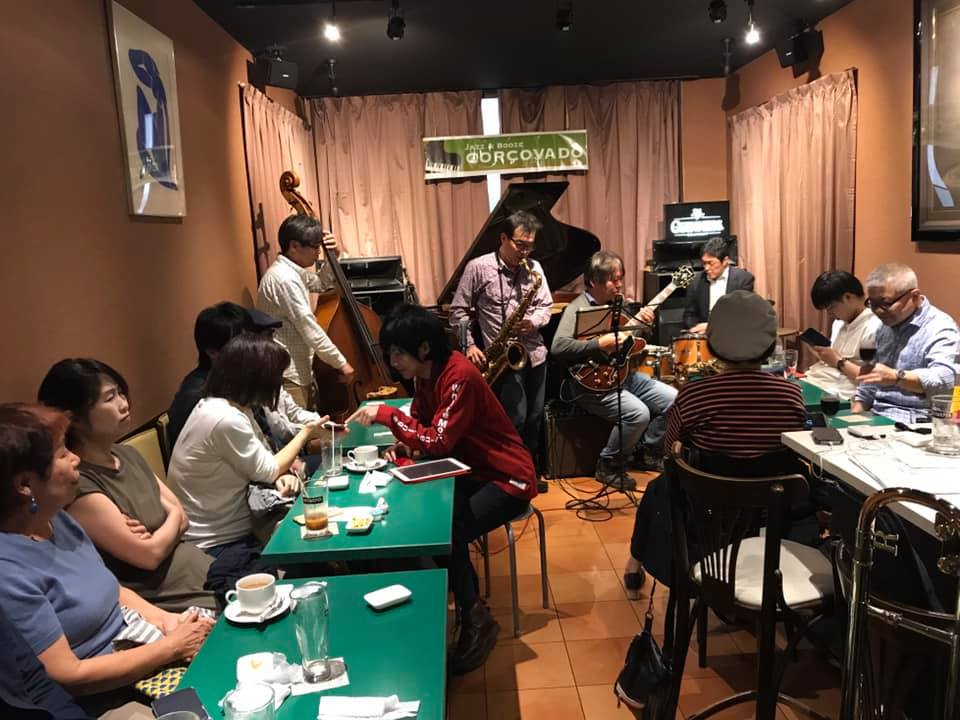 店に入ると演奏中。オーナーのしのぶさん、宮本くん、堅登くんと挨拶。演奏も客席も盛り上がっていました。