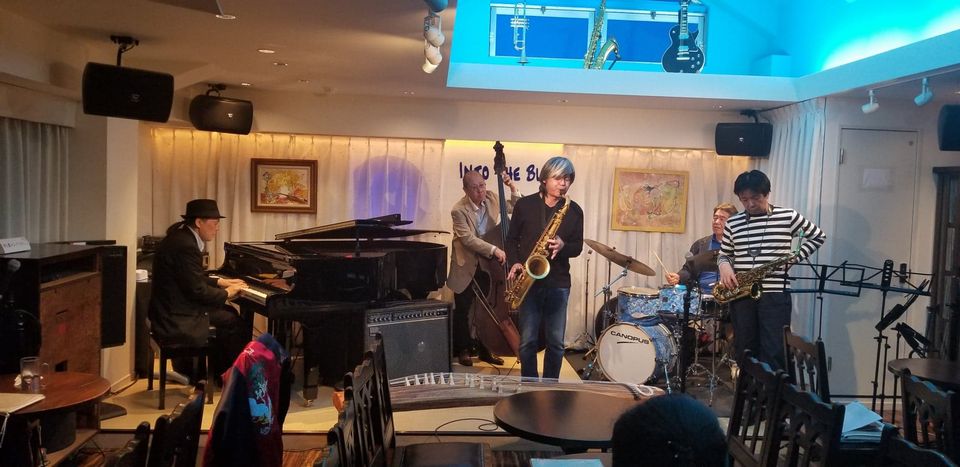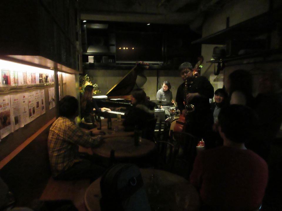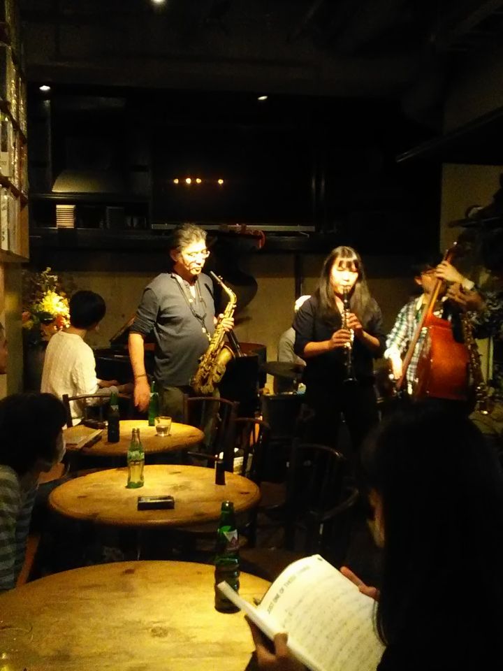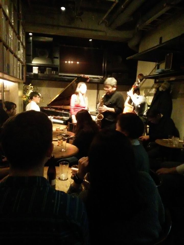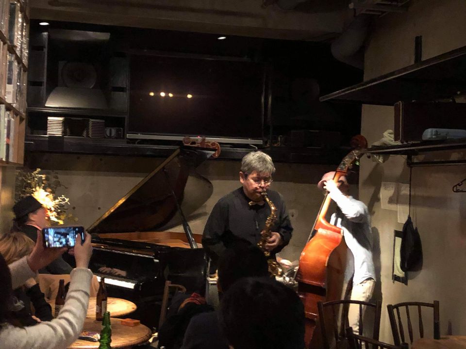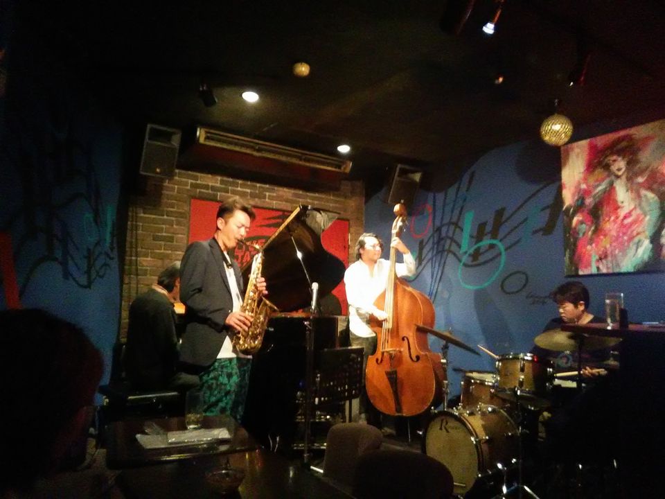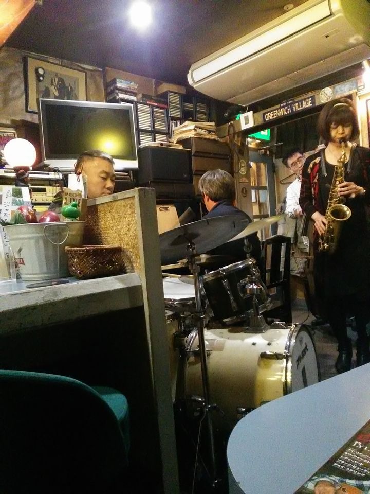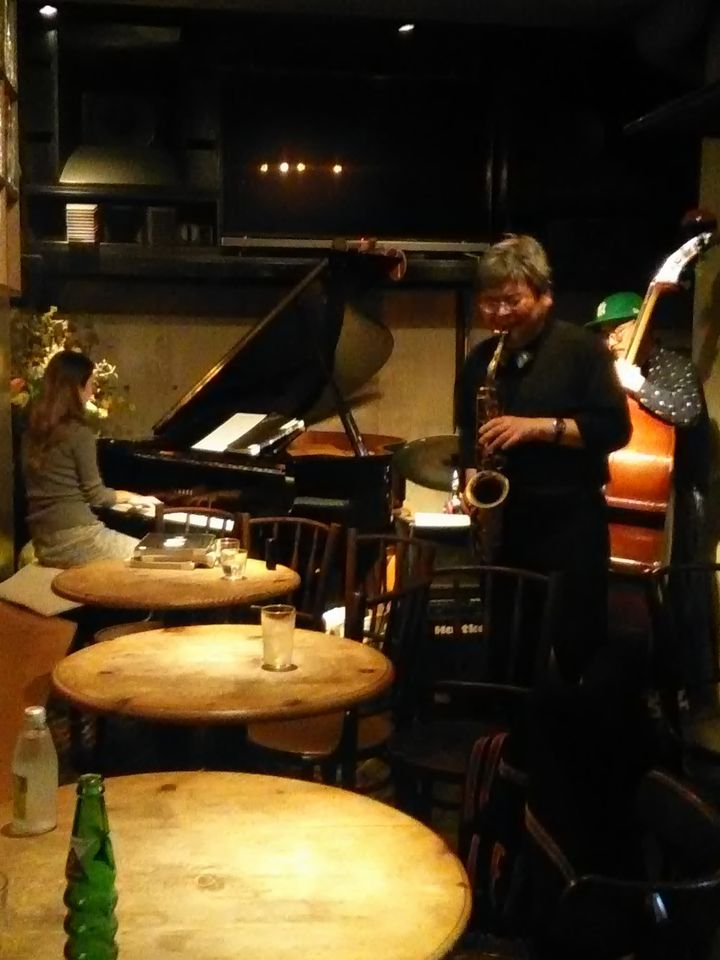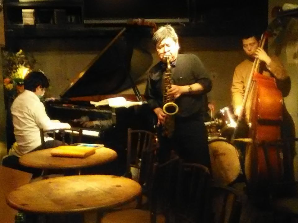 2年前に知り合った豪快なテナー奏者、佐藤公淳さんのライブ&セッションでした。前回の上京に続き2回めで、ベースとドラムもその時と同じ若手の素晴らしい2人、荒井美咲ちゃんと峯麻衣子ちゃんでした。