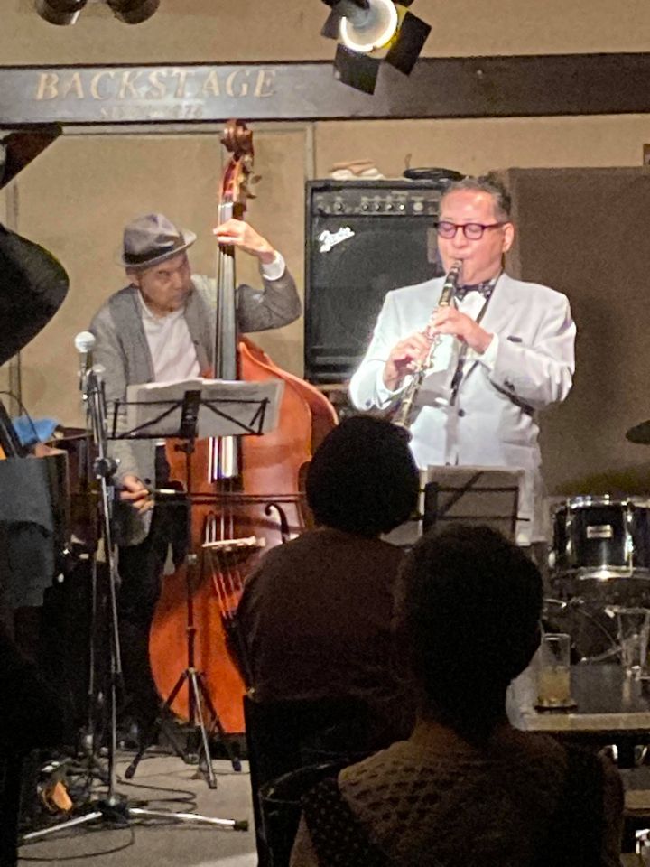 本番。この日も大盛況となりました。知人も多く来ていただきました。わざわざ北九州からもかなりの人数でした。クラリネットでの、シドニー・ベシェ、ベニー・グッドマン、鈴木章治さんの連続演奏なんて、曲は素晴らしいのに今ではあまり演奏されませんので、古いどころか、とても新鮮です。また、お約束どおり中村健さんがいらっしゃって飛び入り、やはり豪華になりますね。高橋さんも含めて、この日も素晴らしいライブになったと思います。