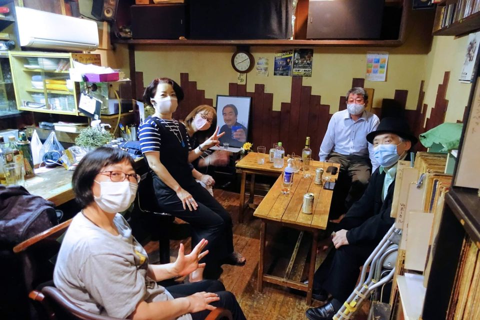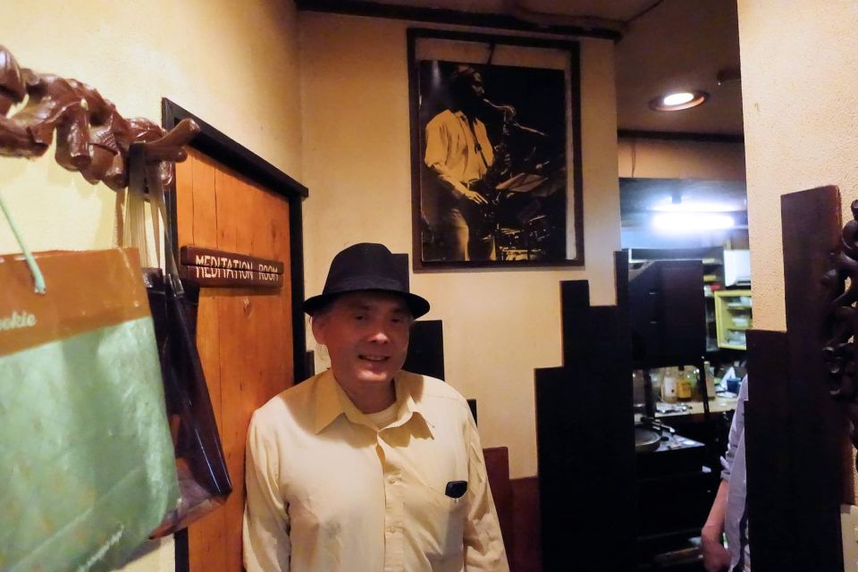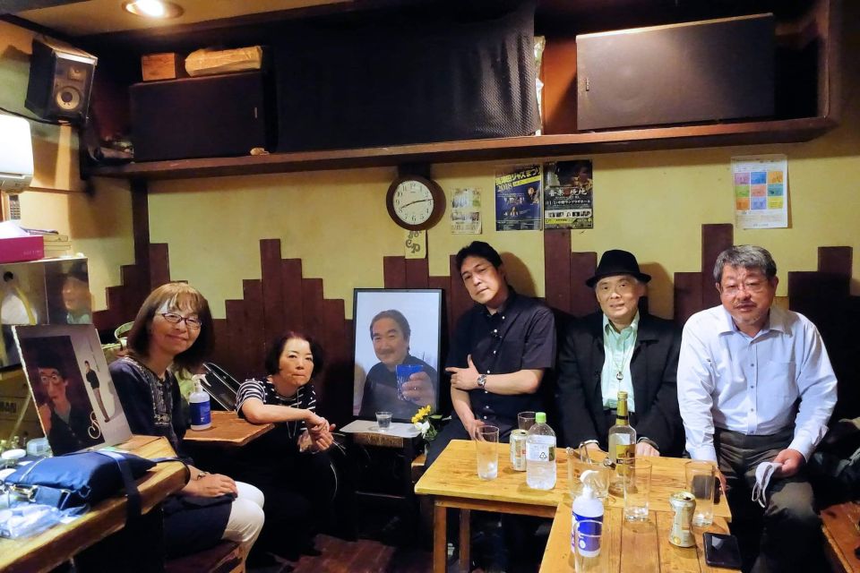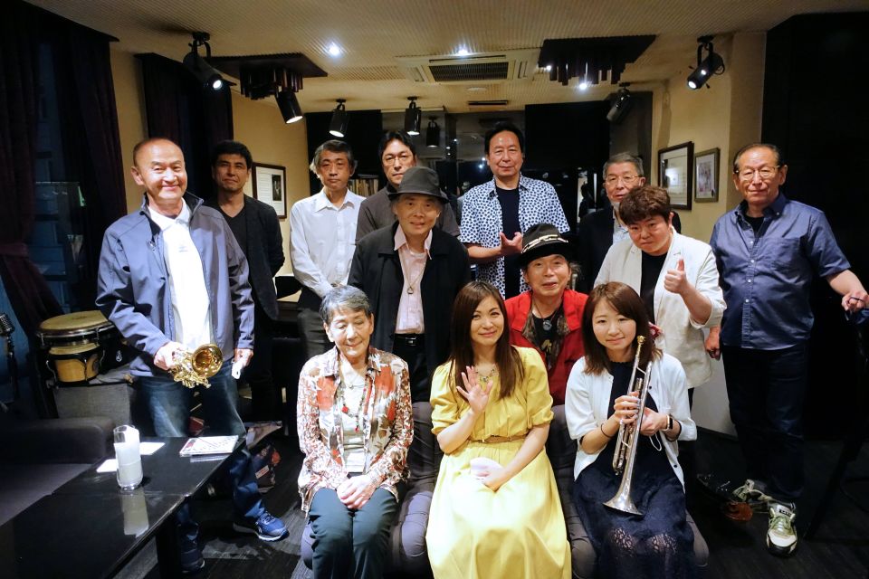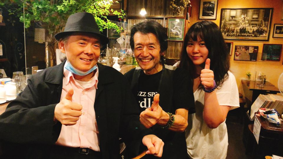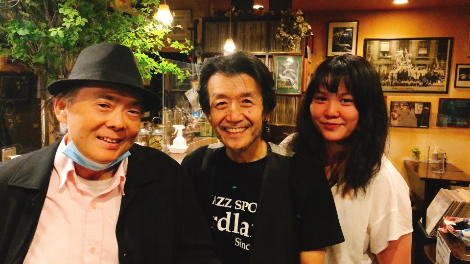 その時の記念写真です。他の方は奥さんとジャズ研や法政ニューオレの先輩同輩後輩で、店は40年近いので開店から数年間の常連です。私は開店1年後に大学進学で上京しました。学生時代はホントよく通いました。マスターがいない時にバラバラだったレコードを全部整理したりもありました。