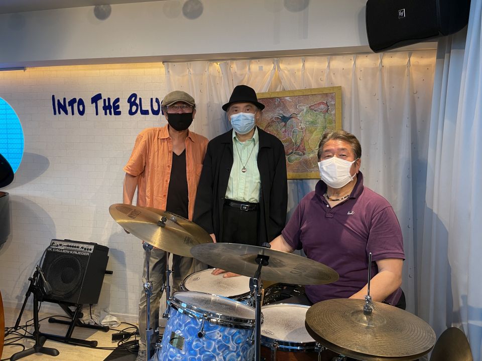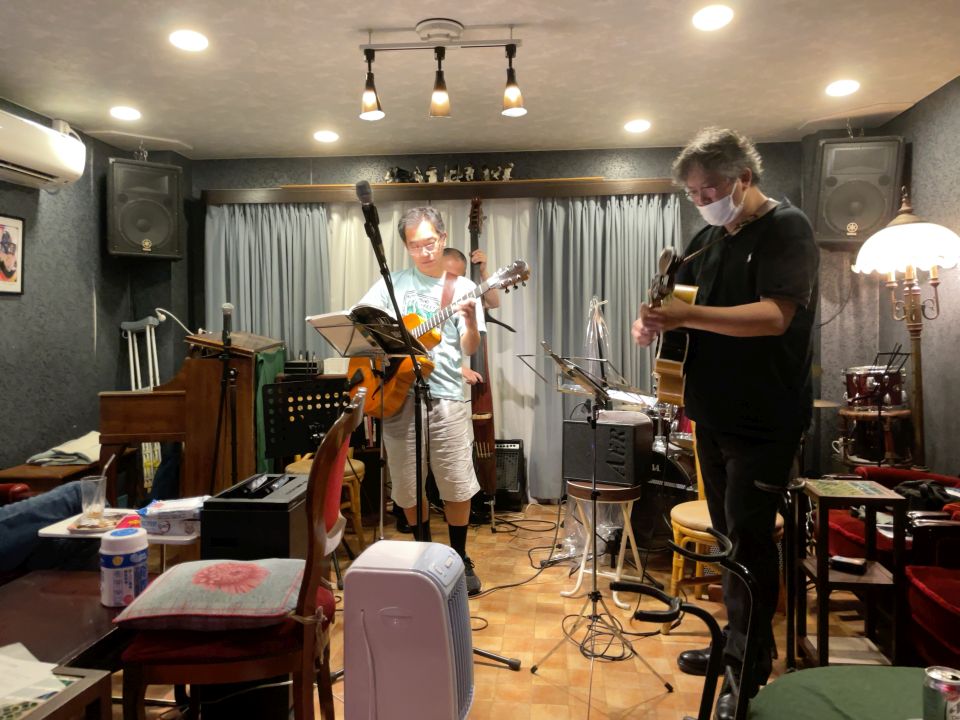 今回のメンバーは、前年11月、前回の上京で初共演だったハーモニカのマツモニカさんと、おそらく25年ぶりのベースの飯田くんでした。