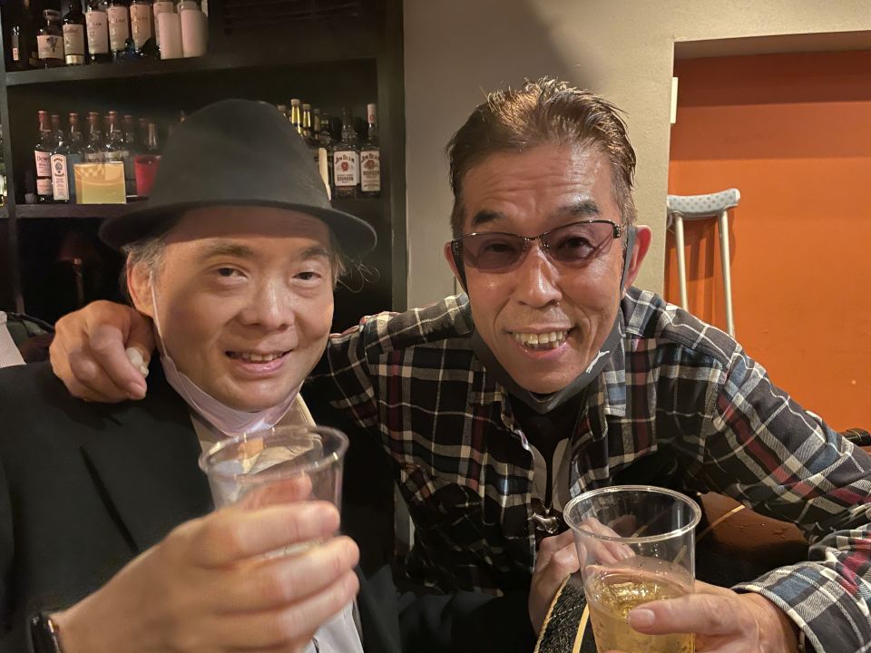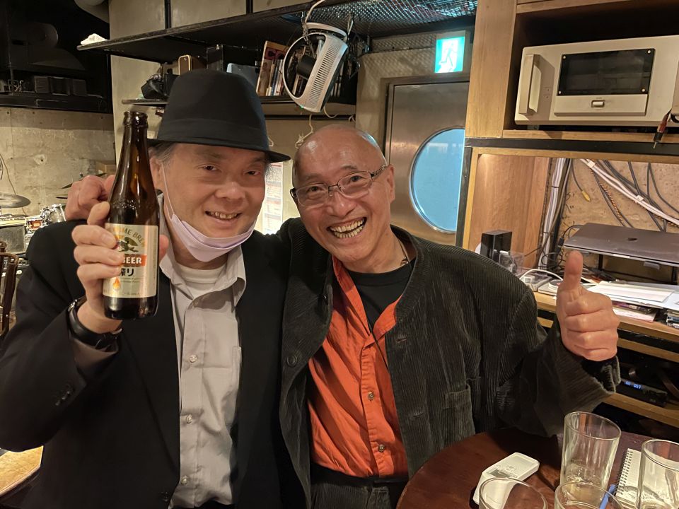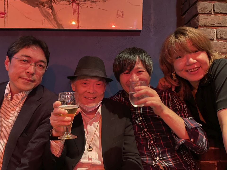 終わって店内で打ち上げ。ベースの楠井五月くん、ドラムの柵木雄斗くん、ヴォーカルの方2名が来店。深夜のセッションや飲み会も盛り上がりました。