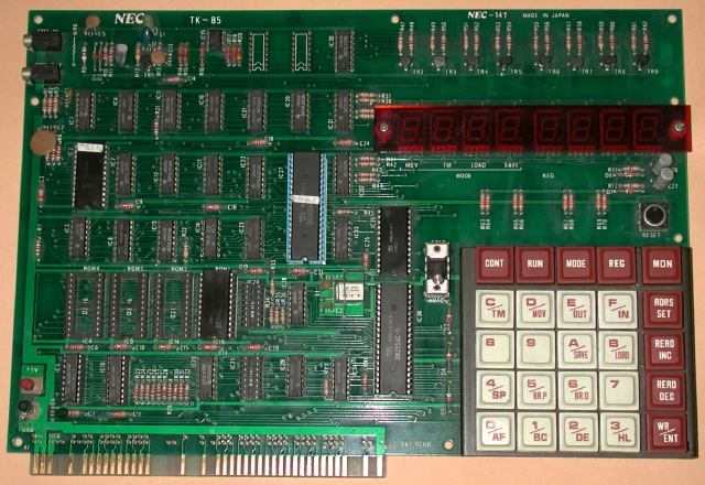これは知る人ぞ知る名機 TK-80 の後継種として発売されたものです。中学3年の時に貯めたお年玉で買いました。ワンボードマイコンで、キーボードは10キーとコントロールキーのみ。表示パネルは8桁のLEDのみ。I/Oインターフェースはカセットテープ用。メモリ12KB。CPUはZ80系の8085。定価は44,800円でした。