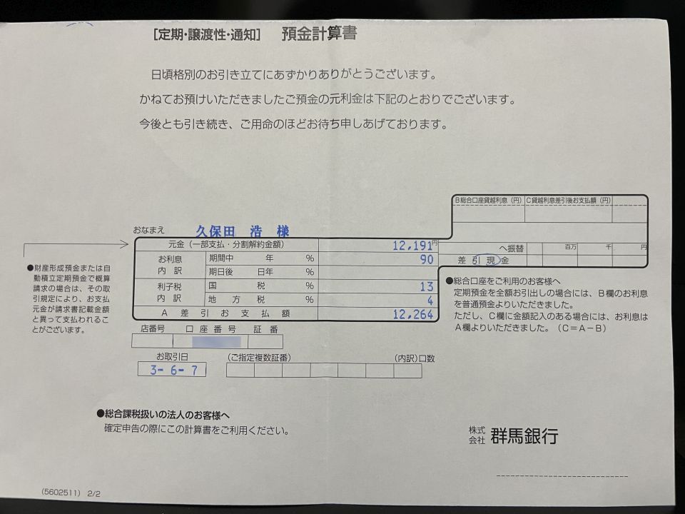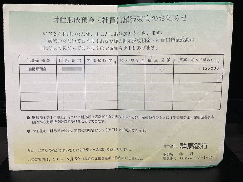 何かというと、何と25年前の群馬銀行の財形で、作ったのは群馬県の藤岡支店。残っていたのはお知らせのハガキ1枚だけでした。まあよく保管していたものです。証書もありません。